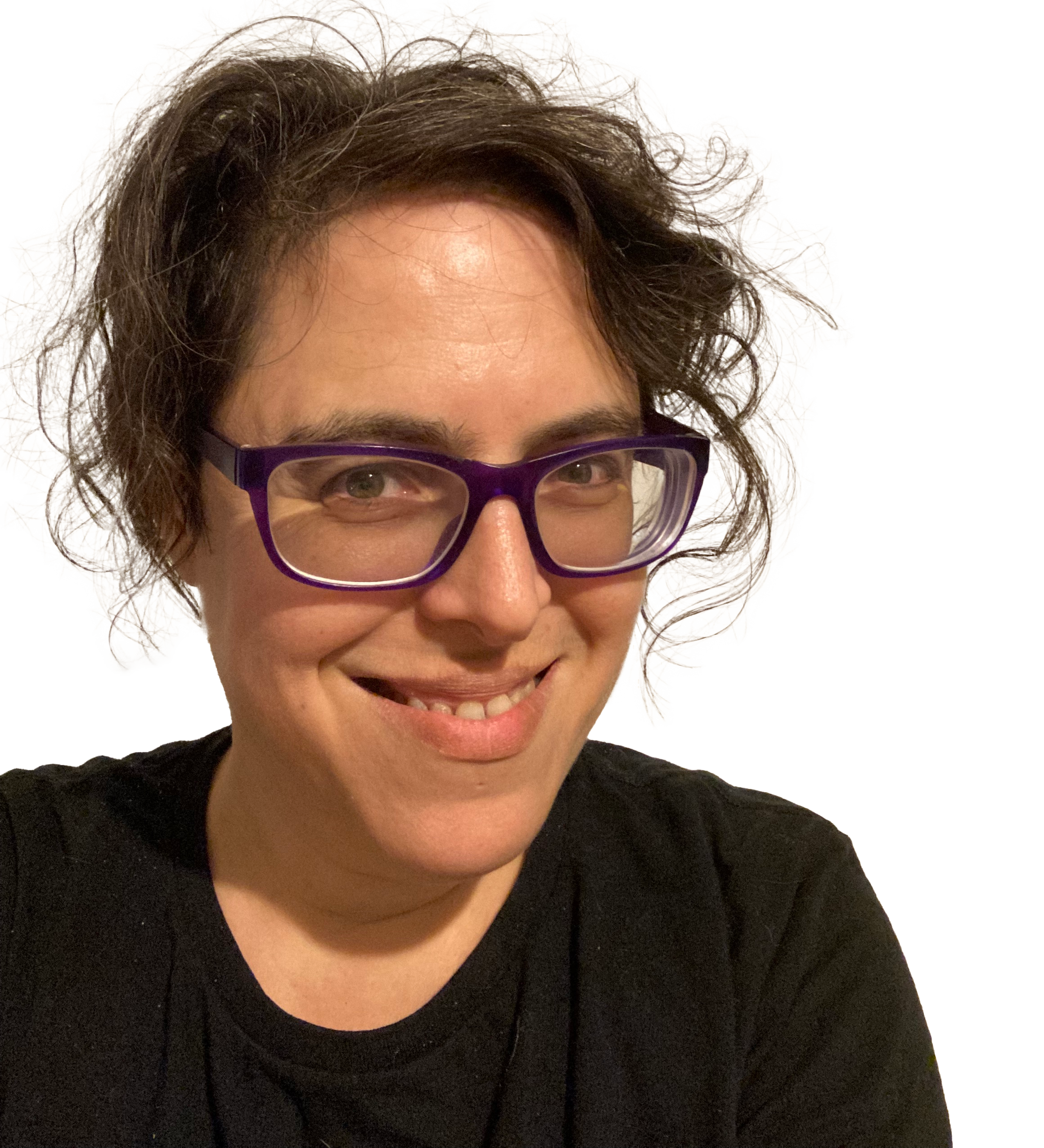 an image of phoenix, the poet, a Jewish person with olive skin and wild brown hair and big purple-framed glasses. Xe is smiling a the camera. Xe is wearing a simple black top.